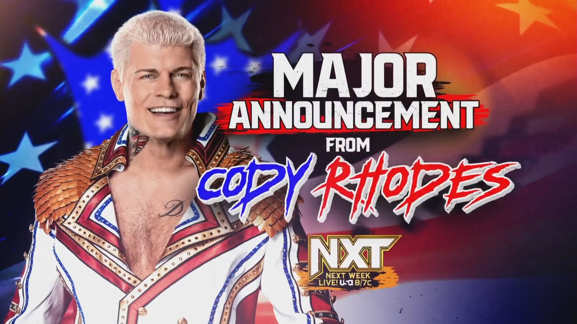 Το NXT ανακοίνωσε ότι ο Cody Rhodes θα είναι παρών στο επεισόδιο της επόμενης Τρίτης 10 Οκτωβρίου και έχει να κάνει μια σημαντική ανακοίνωση.