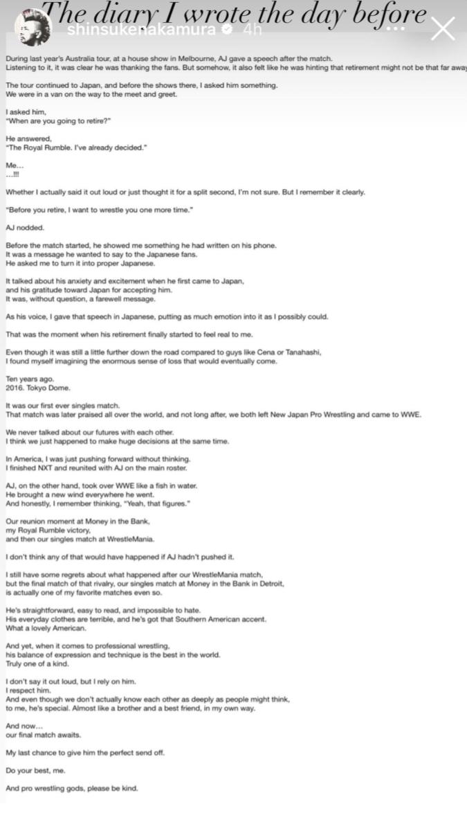 Ο Nakamura ανέφερε επίσης ότι εκείνη τη στιγμή σκέφτηκε ότι πριν ο Styles κλείσει την καριέρα του, ήθελε να τον αντιμετωπίσει άλλη μία φορά, με τον AJ να δείχνει ότι συμφωνεί. Στο ίδιο κείμενο, ο Nakamura έκανε αναδρομή και στο ιστορικό τους πρώτο ματς στο Wrestle Kingdom 10 το 2016, αλλά και σε όλη τη μετέπειτα κοινή τους πορεία στο WWE.